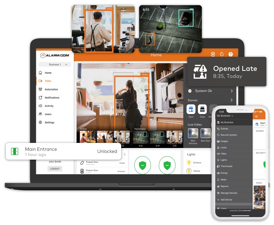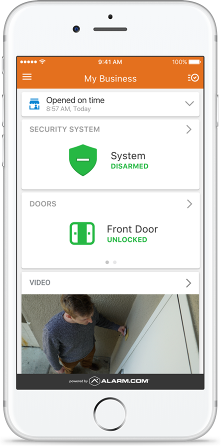 Med vår smartere adgangskontroll fra Alarm.com kan du kombinere brukerstyring med integrert alarm- og videokontroll. Uansett om du har en liten bedrift med én dør eller en stor flerlokasjonsoperasjon med mange dører, har vi en løsning som passer for deg.