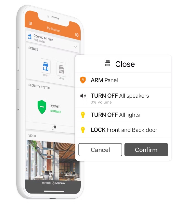Med vår mobil-app kan dine ansatte bruke sin smarttelefon som adgangskort for å få tilgang til dører. Du kan også enkelt legge til eller fjerne adgangsbrukere og kort fra Alarm.coms mobilapp eller nettside. Låser kan åpnes og stenges fra hvor som helst og automatiseringsregler og tidsplaner kan redusere falske alarmer.