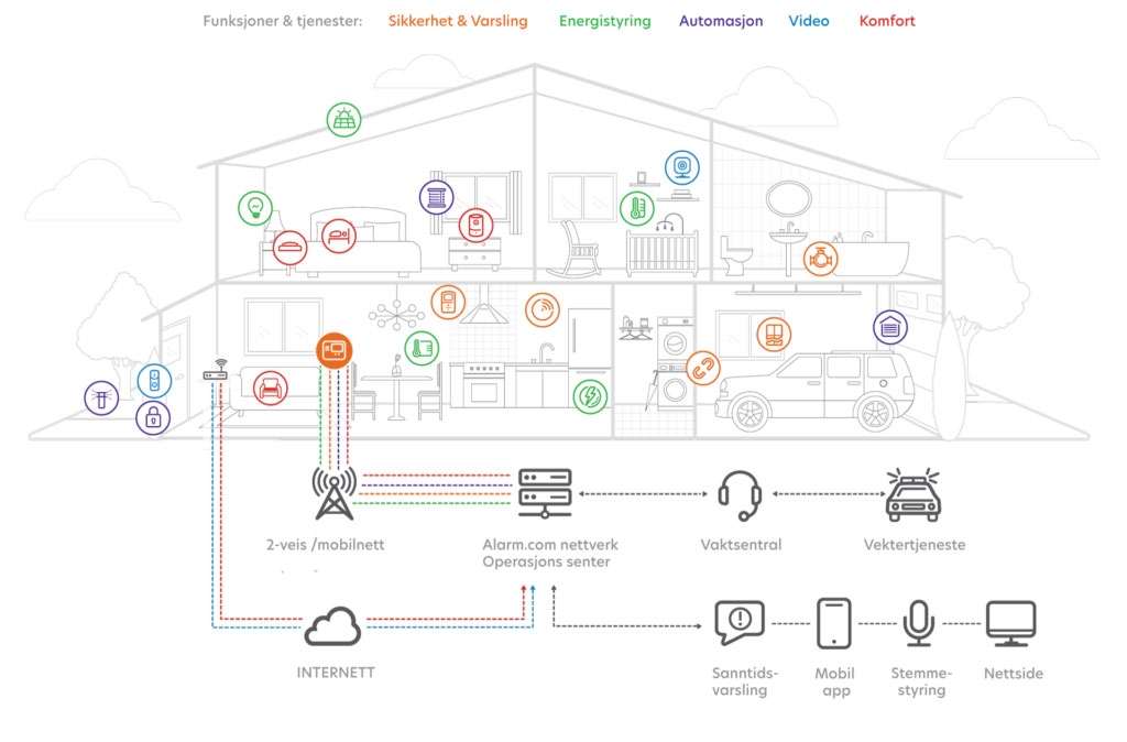Med Smarthus-løsning fra oss har du full kontroll – fra mobil, smartklokke, nettbrett eller pc. Du styrer hjemmet samme hvor du er.